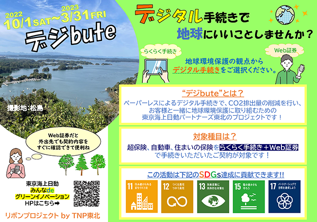 2022年10月以降、Webでのご契約手続き・ペーパレスを推進することでCO2排出量の削減を目指し、お客様と一緒に地球環境保護に取り組むことを目的としたプロジェクトを展開。